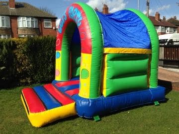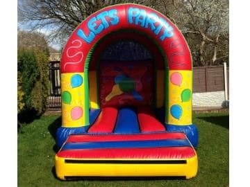A very Colourful bouncy castle in the lets party theme with balloon artwork.